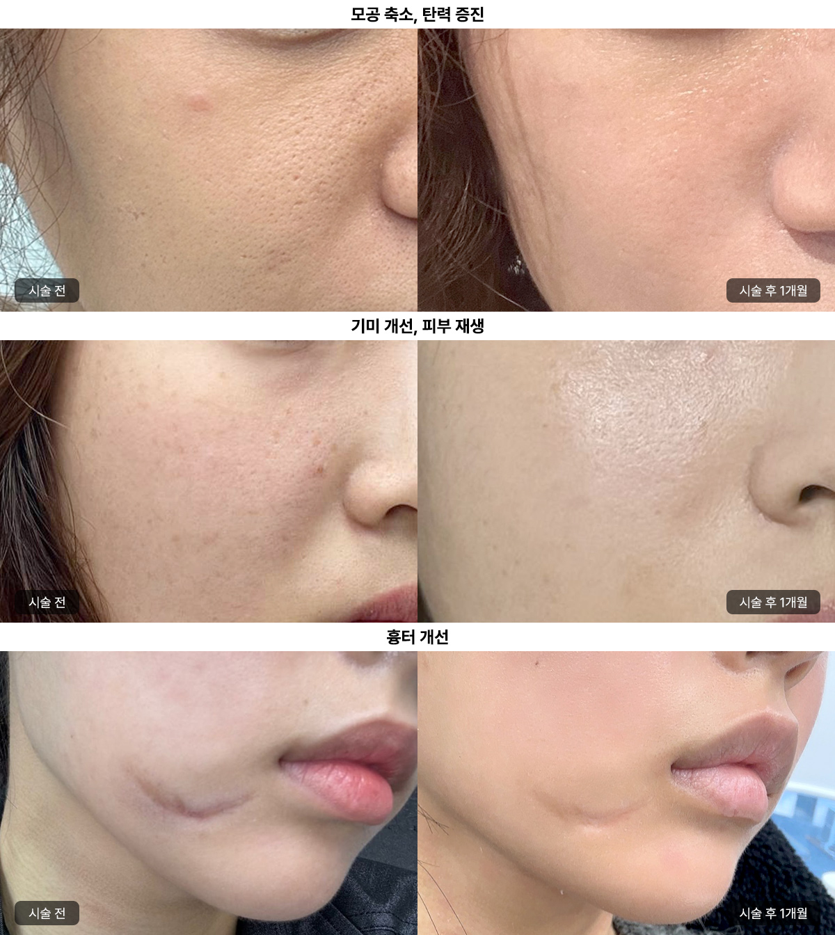 포텐자는 다양한 피부 고민을 해결하는 데 효과적입니다. 넓어진 모공을 콜라겐 재생을 촉진하여 타이트하게 조여주고, 여드름 흉터와 패인 흉터는 새살 재생을 유도하여 흉터를 완화하고 피부결을 개선합니다. 또한 색소침착(기미, 잡티)을 해결해주며, 멜라닌 색소를 파괴하고 배출을 돕습니다. 피부 탄력 저하 및 잔주름 개선에도 효과적이며, 콜라겐과 엘라스틴 생성을 촉진하여 피부 탄력을 높이고 잔주름을 개선합니다. 홍조 및 혈관 질환의 경우 혈관 수축을 유도하여 홍조 증상을 완화하고, 전체적인 피부결을 매끄럽고 건강하게 만듭니다.