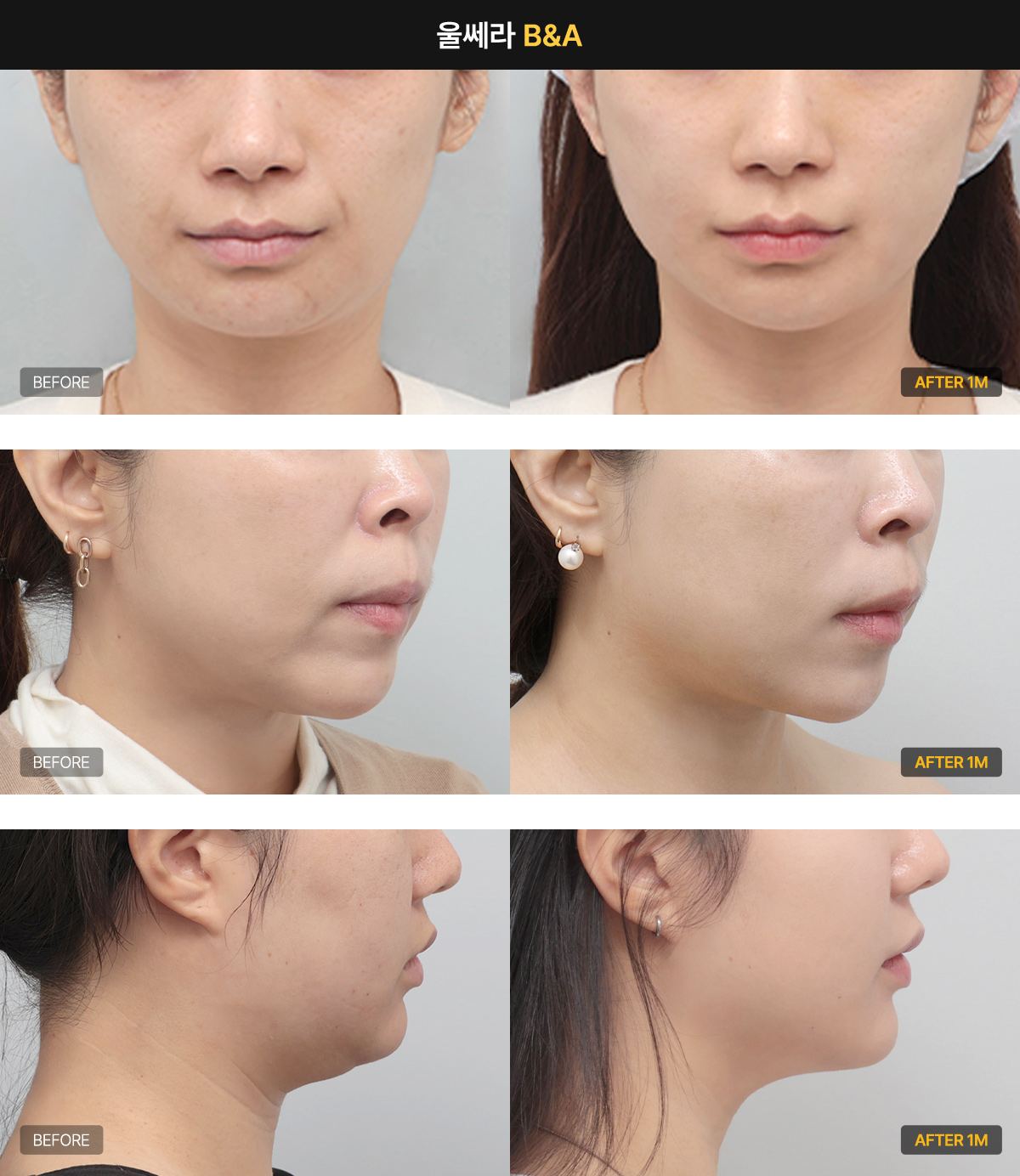 울쎄라 전후 사진에서 확인되는 가장 큰 변화는 단순 탄력 개선이 아니라 얼굴 윤곽라인이 정돈되는 리프팅 변화입니다. 즉, 울쎄라리프팅의 핵심은 피부 표면이 아니라 얼굴 전체 구조의 리프팅입니다.