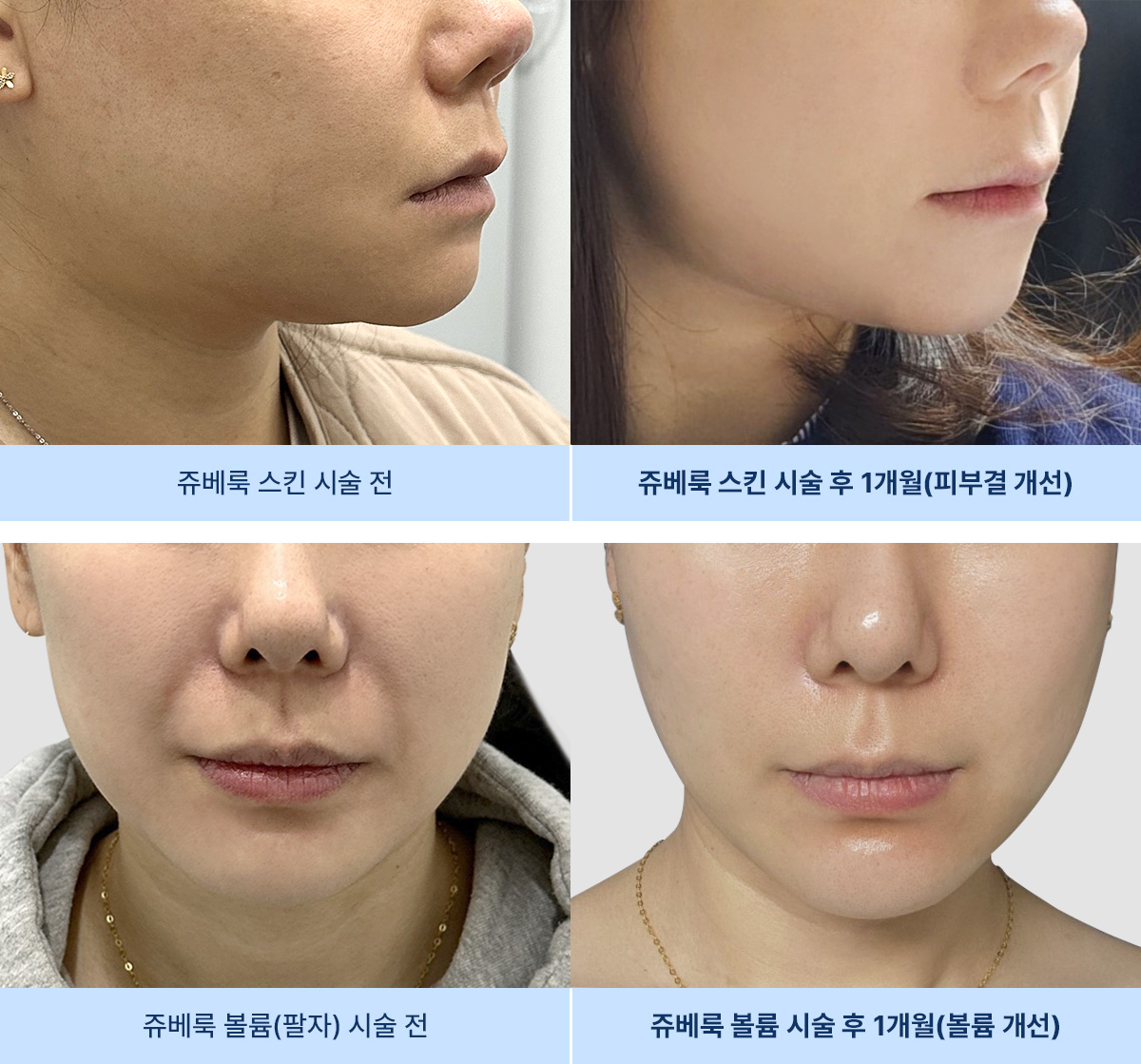 쥬베룩 스킨은 피부의 표면 개선과 피부 톤을 중점적으로 다루며, 볼륨 시술은 얼굴의 입체감을 개선하여 더 선명한 얼굴 라인을 만들어줍니다.